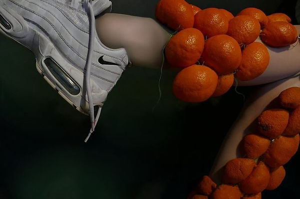 These garments were created using orange peel to explore waste, material fragility, and the fleeting nature of consumption. By transforming discarded food into wearable forms, the project questions ideas of value, permanence, and excess within fashion systems.